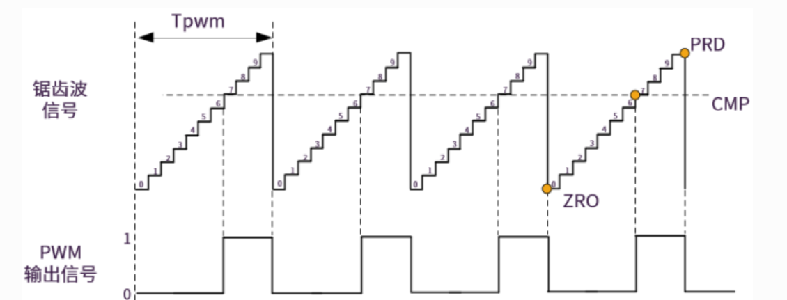 为了灵活调节PWM信号的占空比,要先想办法产生一个递增、或者递减的锯齿波信号,另外再结合一个比较器来跟一个阈值进行比较,当满足条件时进行电平反转,这样达到的效果就是通过调节“阈值”来调节了占空比。
