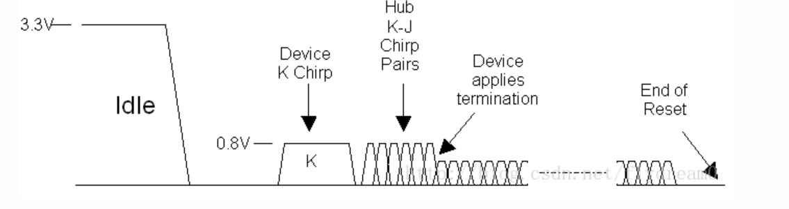 设备发送的 Chirp K 信号结束后 100 us 内,Hub 必须开始恢复一连串的 KJKJKJ… 序列,向设备表明这是一个 USB2.0 的 Hub。这里的 KJ 序列是连续的,中间不能间断,而且每个 K 或 J 的持续时间在 40 us ~ 60 us。KJ 序列停止后的的100-500 us 内结束复位操作。Hub 发送 Chirp KJ 序列的方式和设备一样,通过电流源向差分数据线交替灌 17.78 mA 的电流实现。
