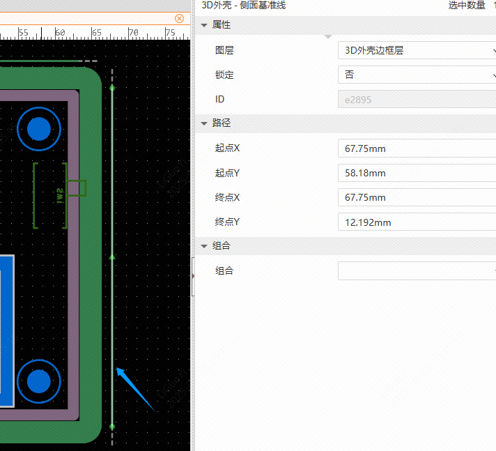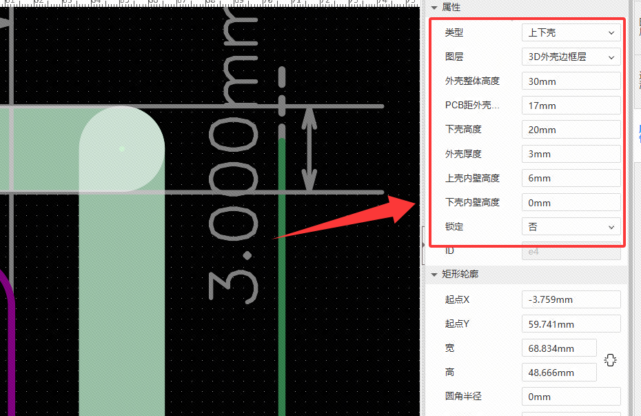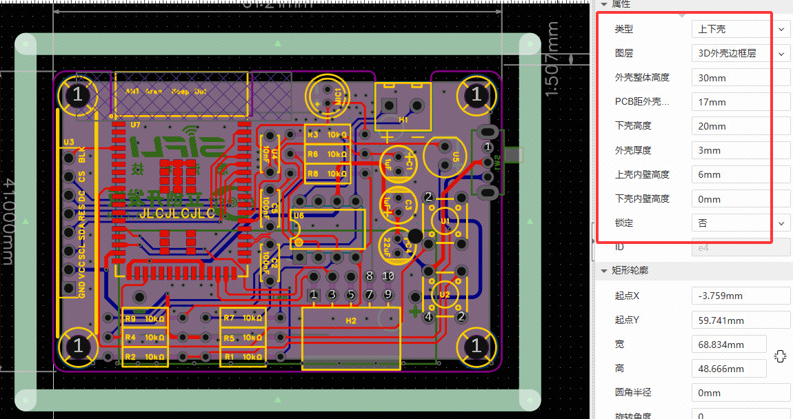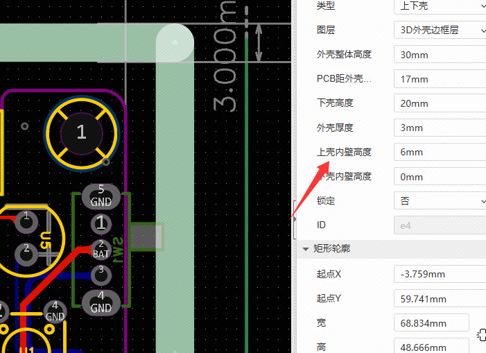 点击PCB界面中的外壳线,在右边的属性栏中,设置是使用上壳内壁还是下壳内壁,使用哪一个就设置哪一个内壁为多长。比如设置上壳内壁为6mm。