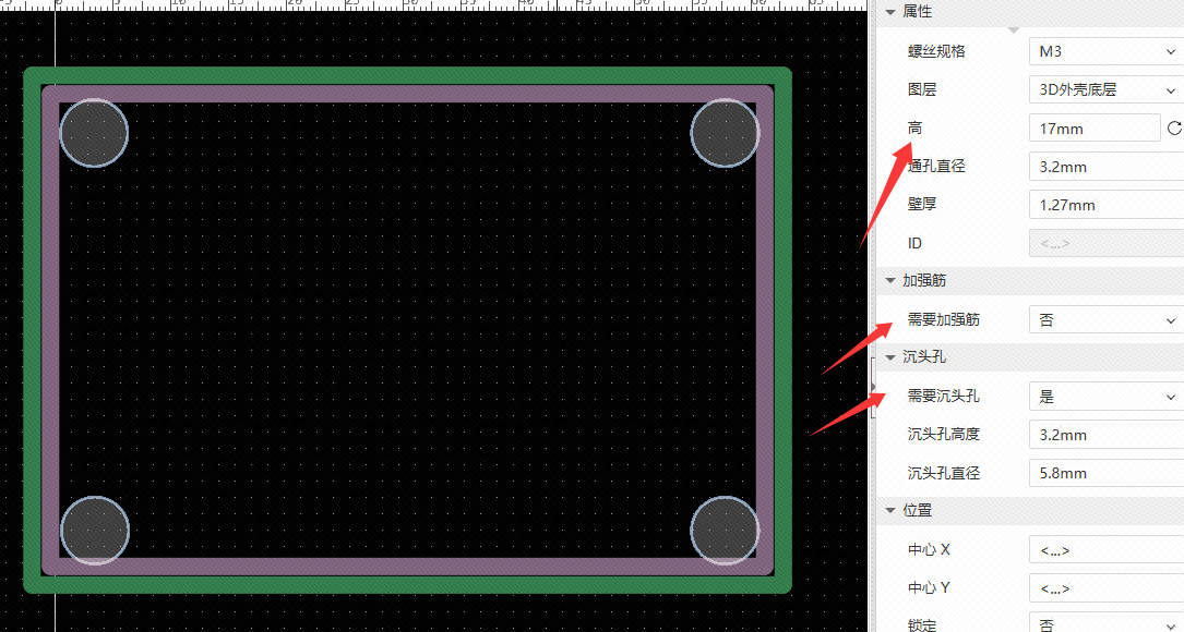 放置螺丝柱时需要确保你的PCB上也有螺丝孔才行,不然也无法固定。比如参考案例中,我们的PCB在四个角落都放置了 M3 尺寸的螺丝固定孔,在放置外壳的螺丝孔时需要对上我们PCB上的螺丝孔。