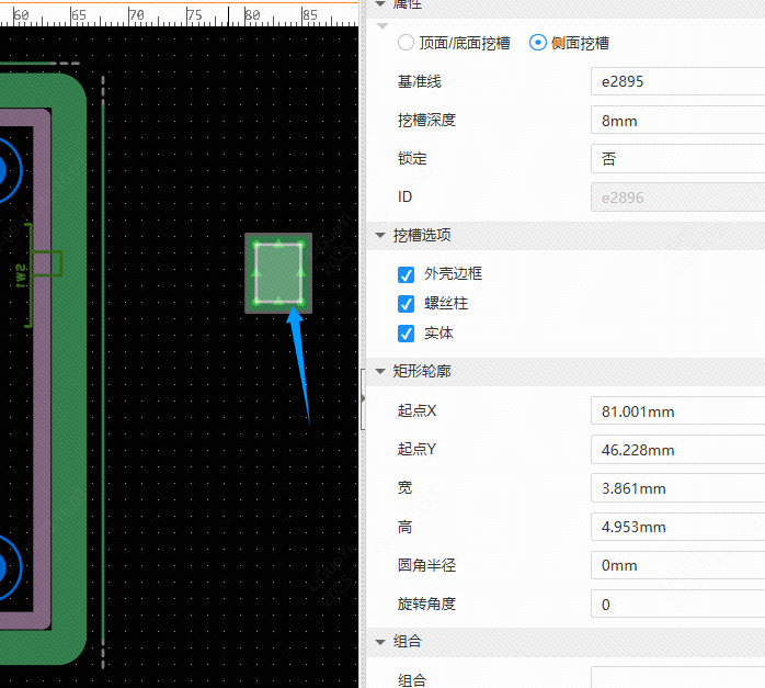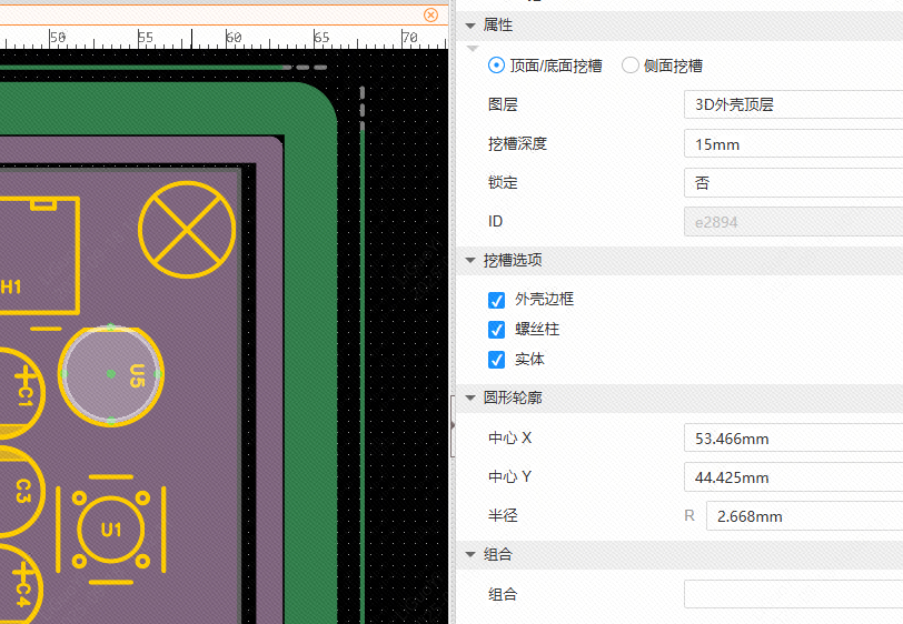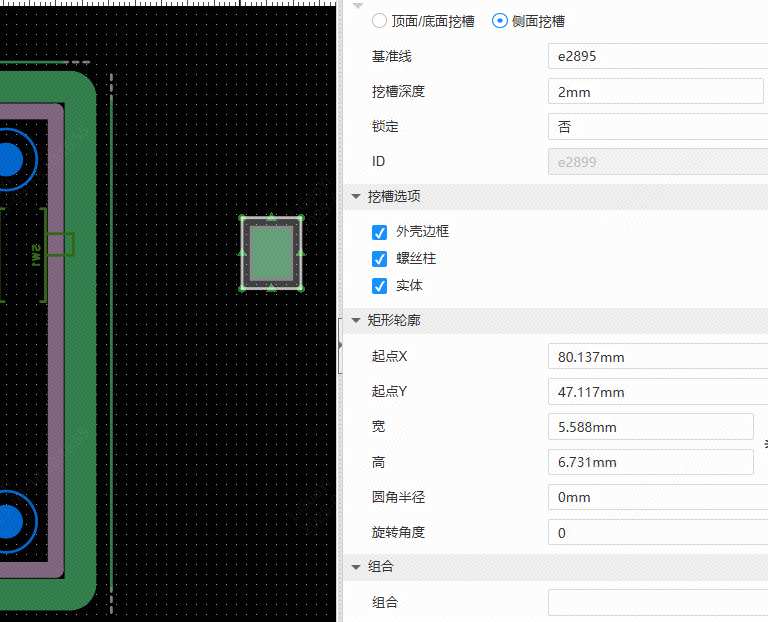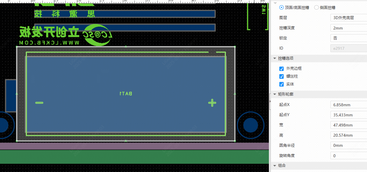 对准PCB屏幕的显示区域放置该挖槽区域,并设置为顶层挖槽,宽高:35.239x29.501mm,圆角半径5mm,挖槽深度15mm。