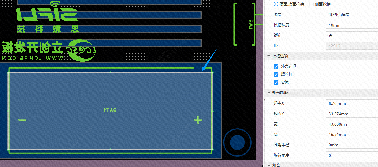 首先是屏幕区的设计。选择 放置 -> 3D外壳-顶面/底面挖槽区域 -> 矩形。