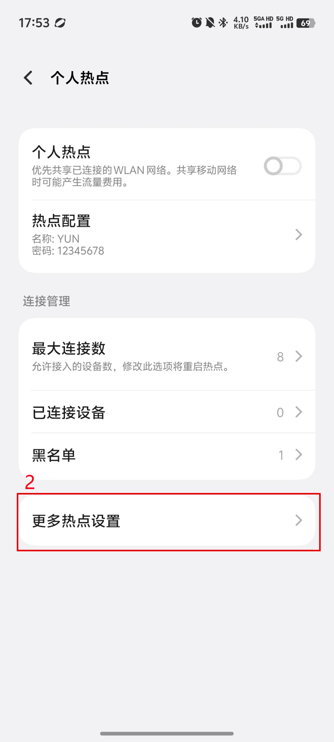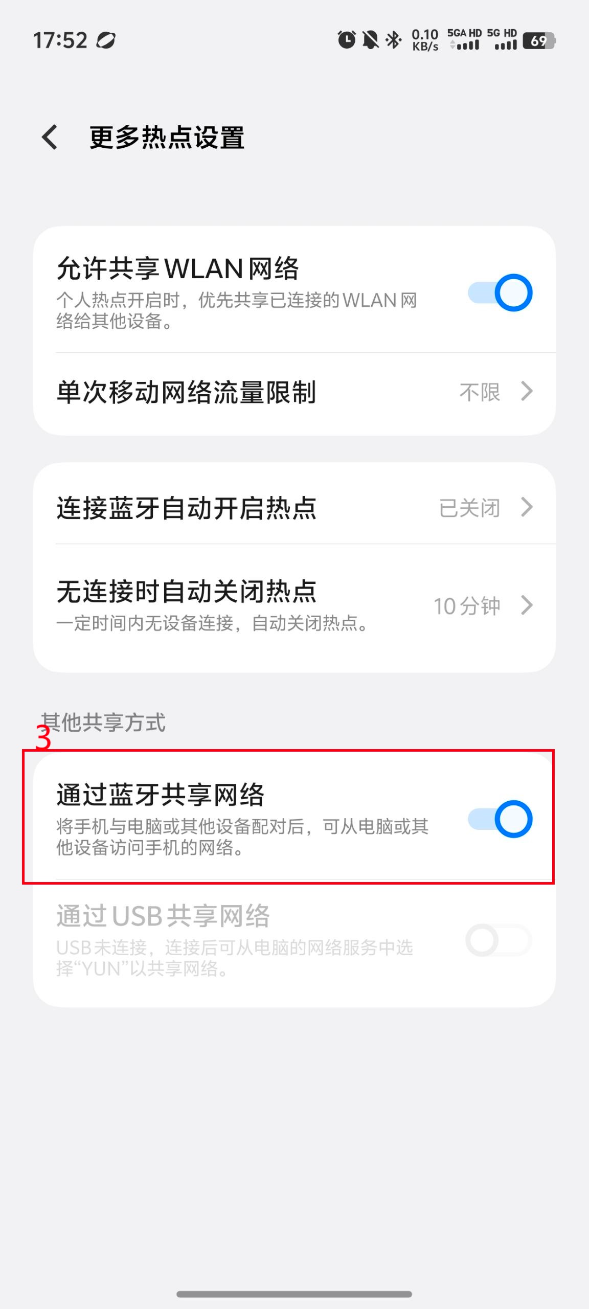以下是Android手机的蓝牙设置界面,通过打开个人热点共享中的蓝牙共享网络功能。