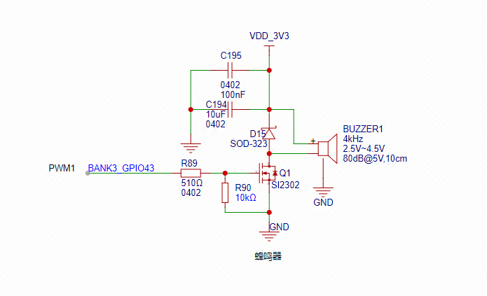 D15在这里的主要作用是保护这个驱动的MOS管,因为蜂鸣器和电机一样是一个感性元件,也就是说它的电流是不能瞬变的。必须有一个续流二极管提供续流。如果没有这个续流二极管,停止给蜂鸣器供电的时候在蜂鸣器两端会有反向感应电动势,产生高达几十V的尖峰电压,很有可能损坏驱动电路。 R89:限流电阻,防止电流太大损坏芯片的PWM输出引脚。R90就是一个简单的下拉电阻了。