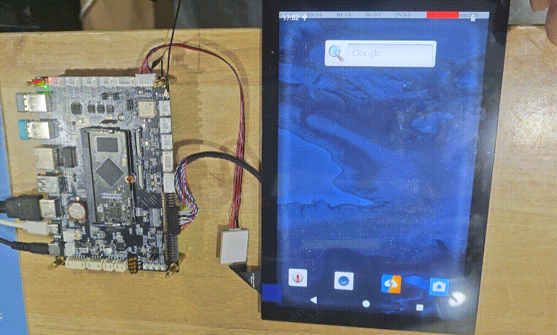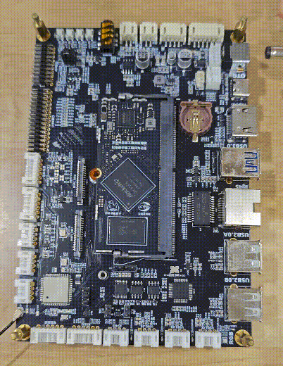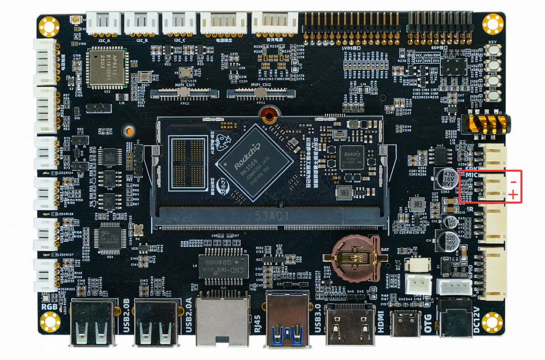 将核心板安装好后,接入电源到DC座即可上电。如无异常,则系统正常启动,RGB灯开始亮灯并不断变换颜色。