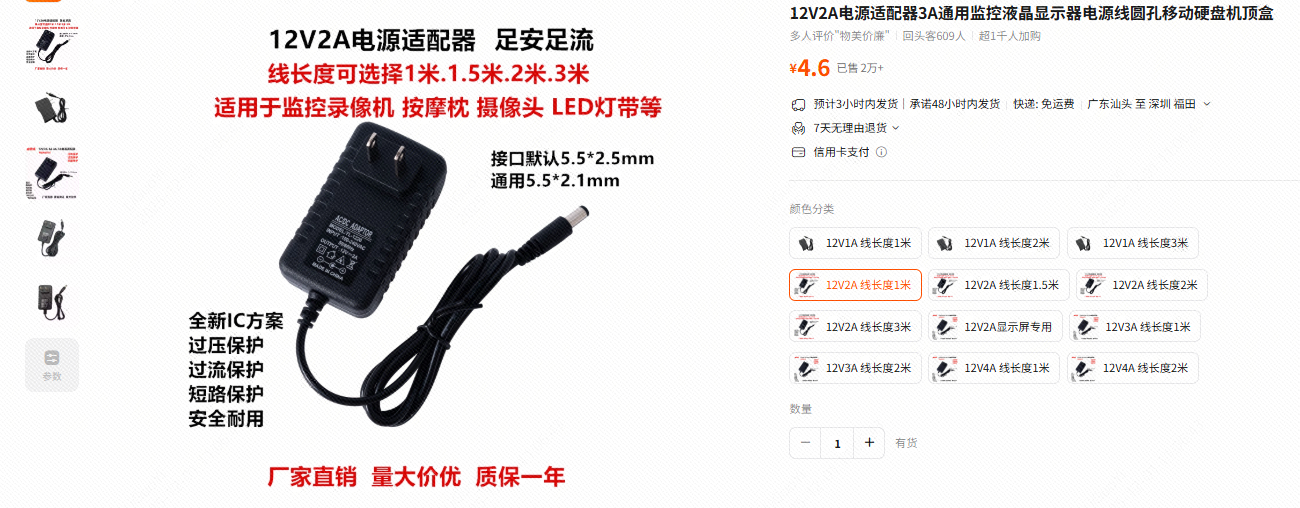 全功能验证板使用的是 12V-2A 的 DC电源插座,参数:内径:2mm 外径:5.9mm
