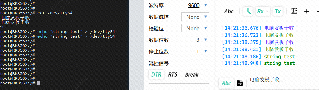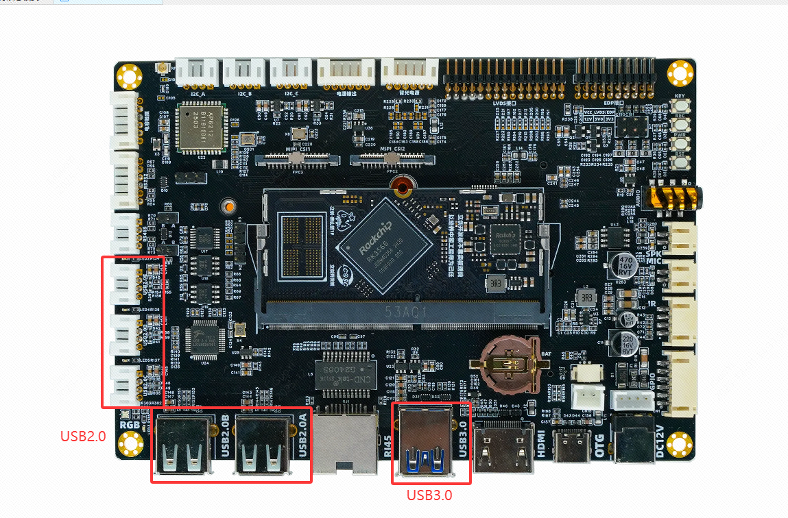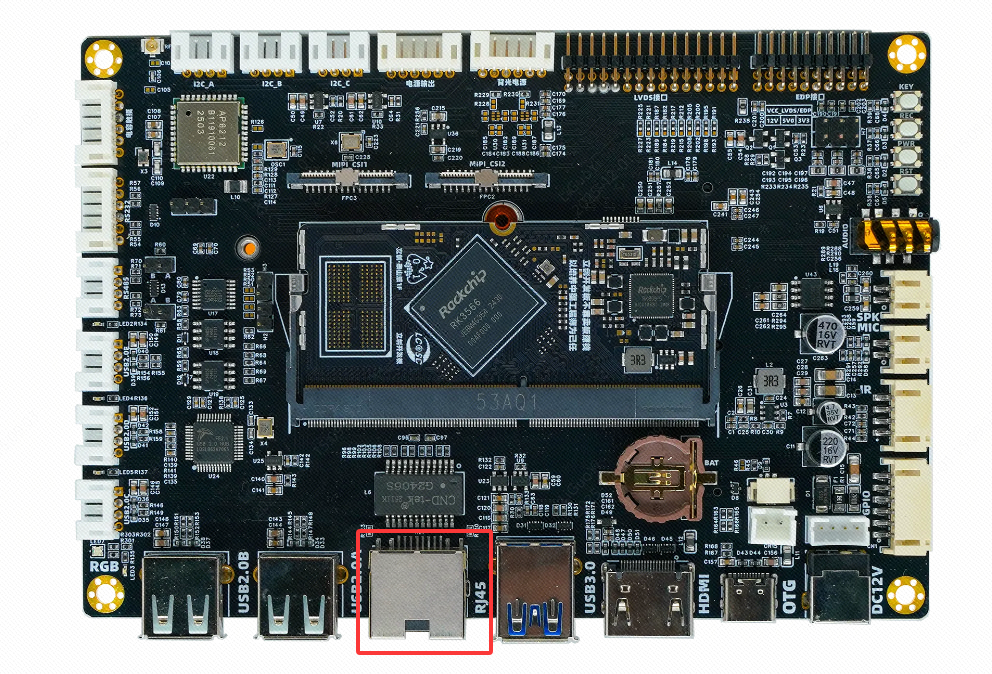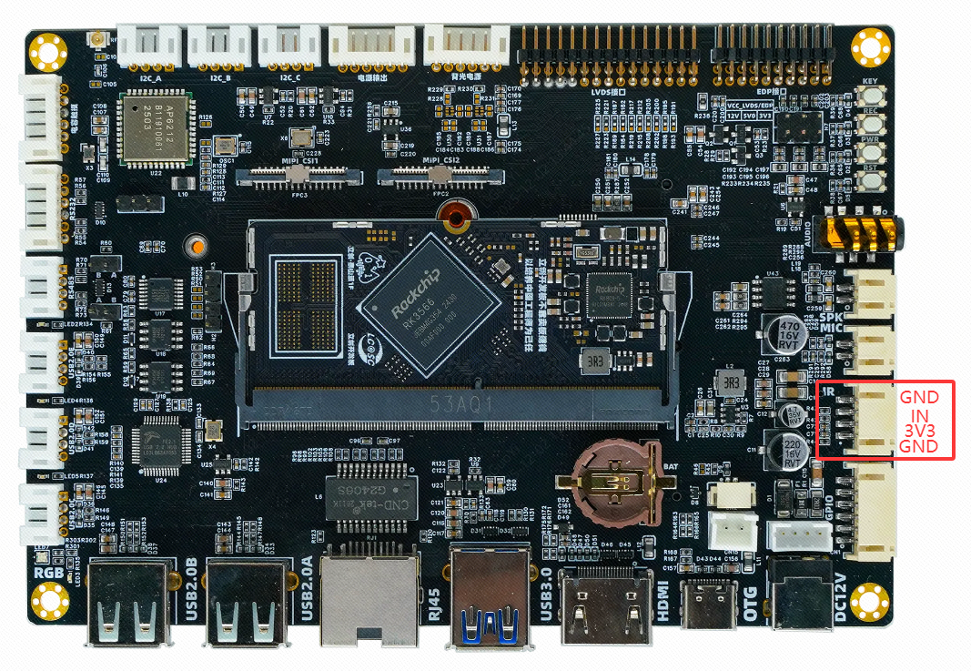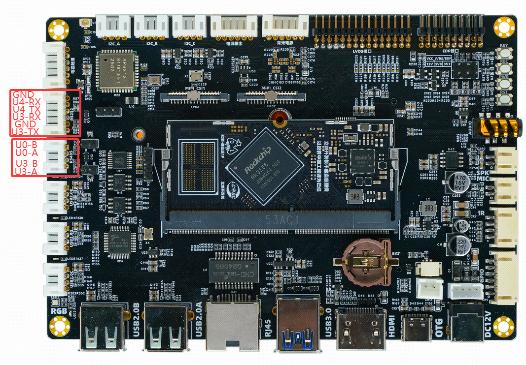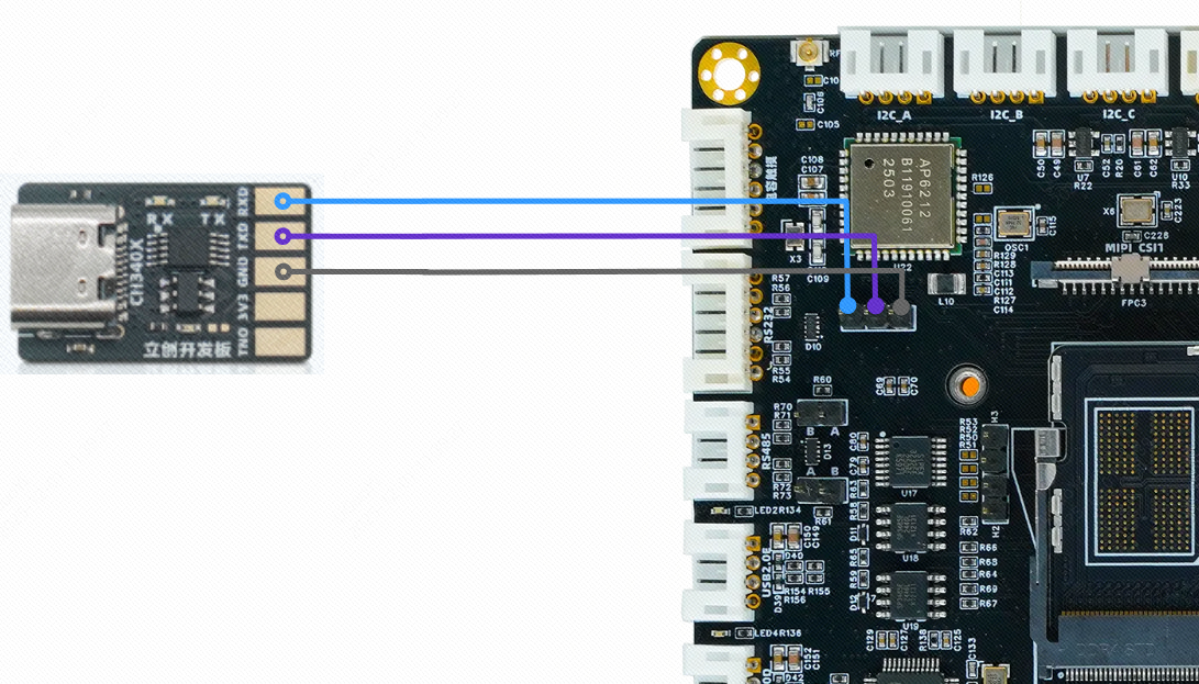 RK3566 的调试端口 UART2_RX_M0 与 UART2_TX_M0 通过底板的 3Pin 2.54mm排针引出,接线是只需接 TX,RX,GND 三根线即可,需注意底板 TX 对工具 RX,底板 RX 对工具 TX。