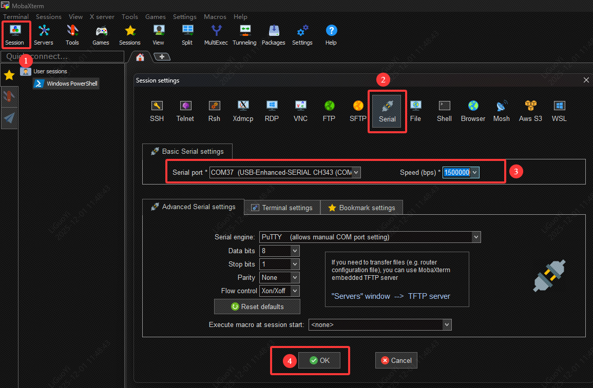 调试串口的波特率为 1500000 ,8位数据位,1位停止位,无校验位。