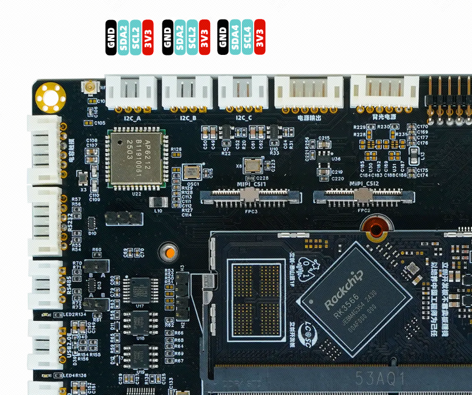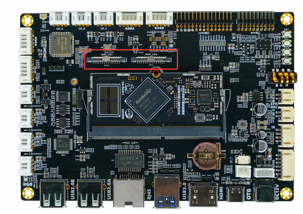 板载了两个 MIPI CSI 摄像头接口。SDK默认使用 OV5695 作为设备驱动。接口与接法:
