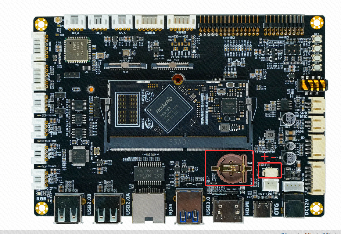 板载了一个型号为 HYM8563S 的 RTC 时钟。使用时需要接入电池,底板上有两个电池接口: