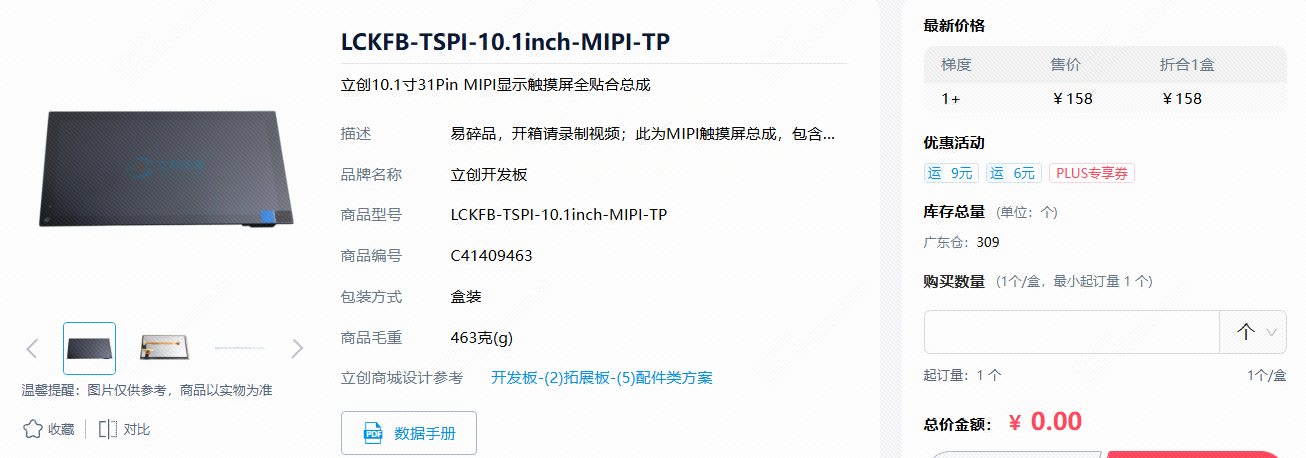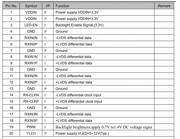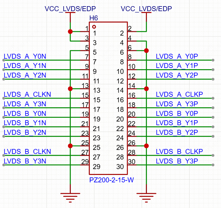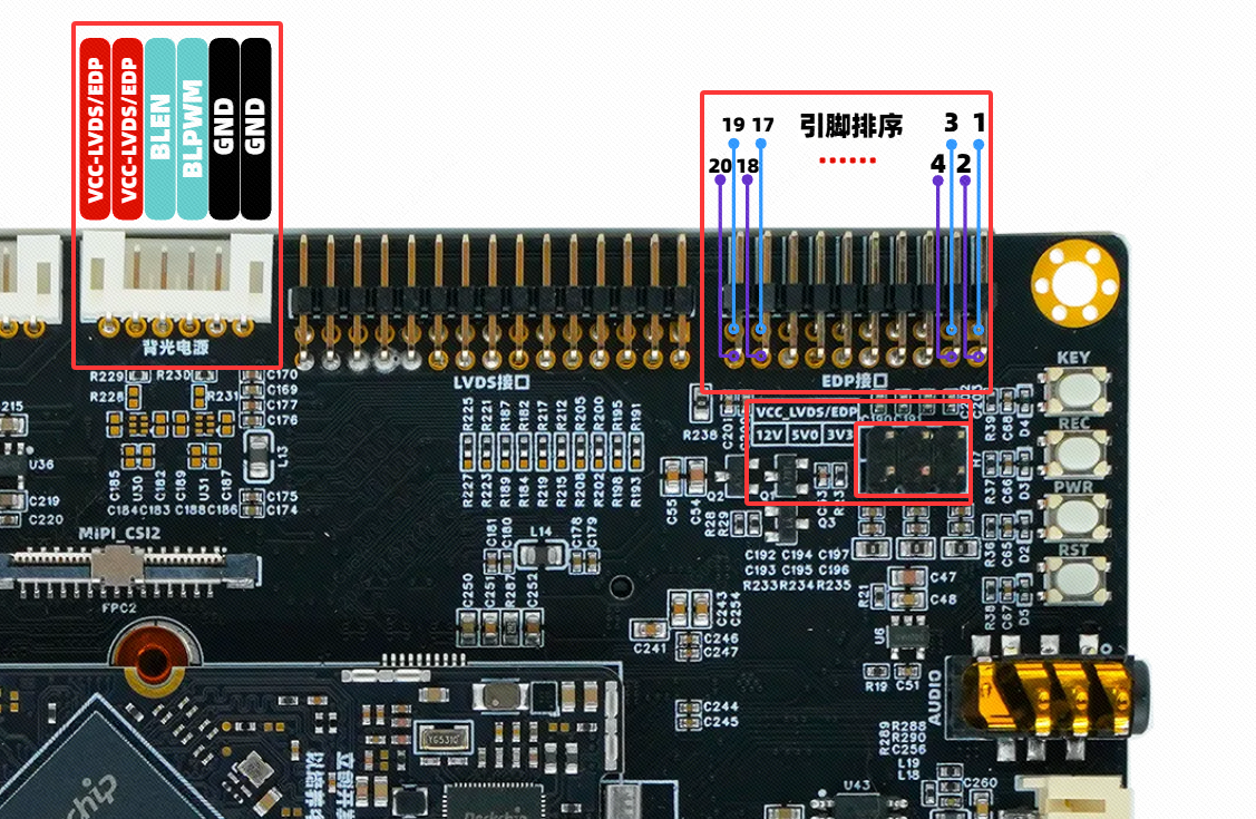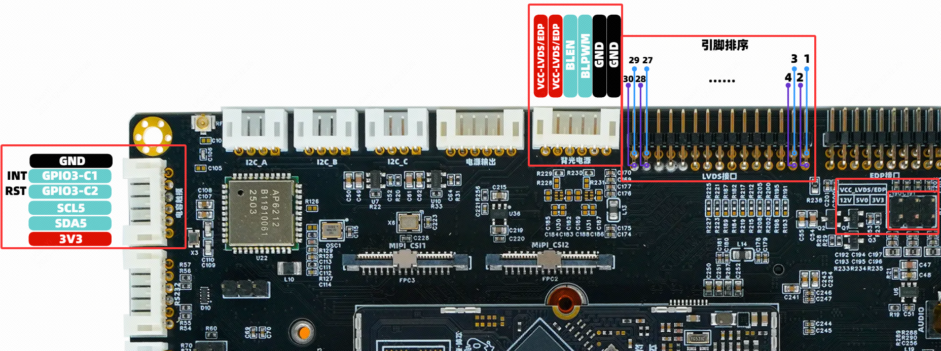 该屏幕并没有一比一完全匹配底板的线序,需要手动调整屏幕线材的线序适配底板LVDS接口线序,同时该屏幕背光电源支持3.3~12V,需要在底板右上角的 H7 排针处使用跳帽短接 VCC_LVDS/EDP 和 3V3 电源才有背光亮。