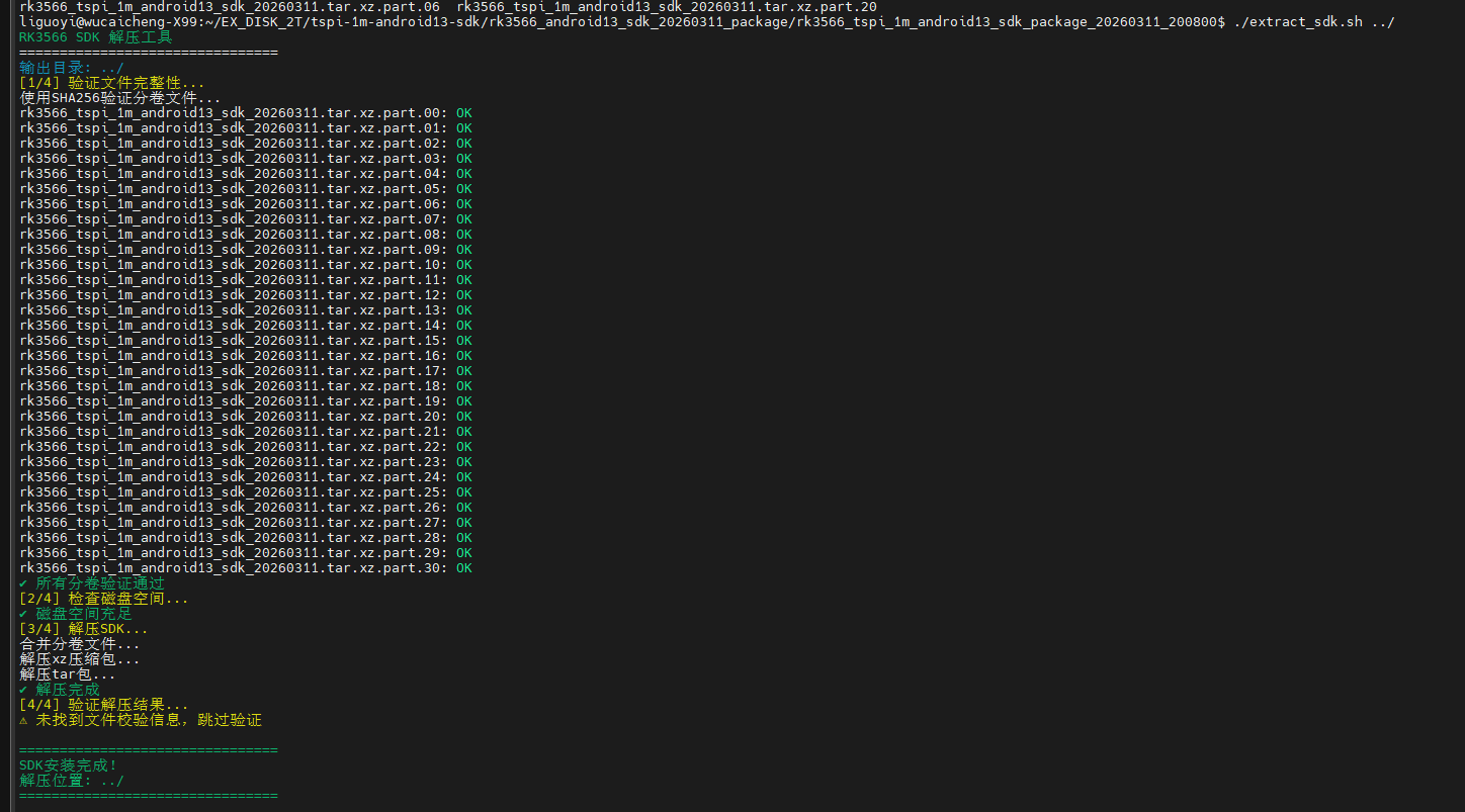 ./extract_sdk.sh ../在脚本执行时,会进行文件校验,校验时所有文件都显示 OK,则说明文件完整,可以安全解压。如果有文件校验失败,需要重新下载对应的压缩包。